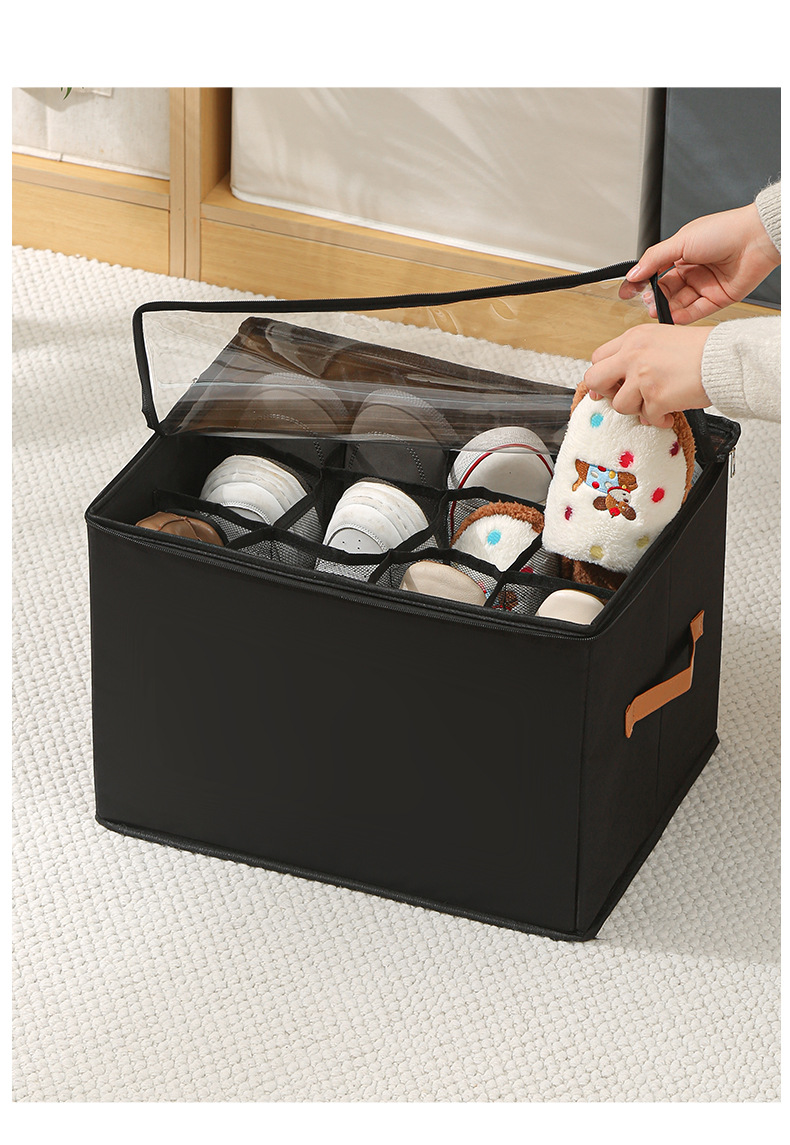 Foldable shoe storage box with visible cover and compartments